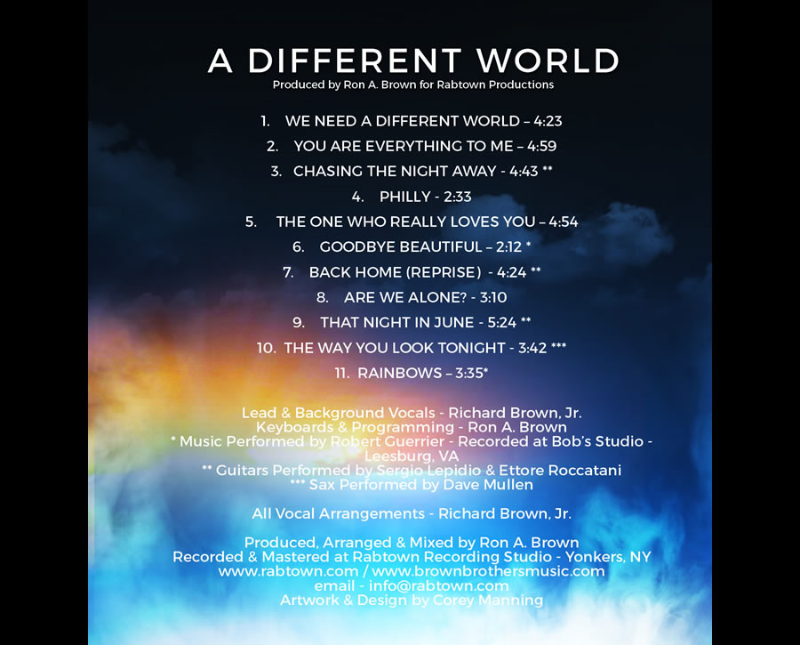 The follow up CD “A Different World” released by brothers Richard Brown Jr. and Ron A. Brown is a collection of R&B / Smooth Jazz original tracks..